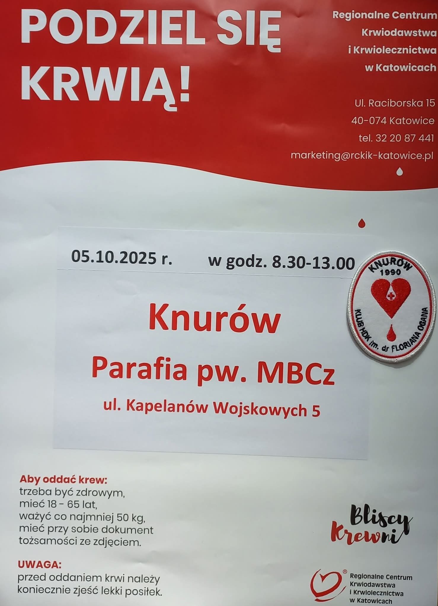W niedzielę, 5 października, w godzinach 8:30 – 13:00 przy kościele Matki Bożej Częstochowskiej odbędzie się kolejna akcja krwiodawstwa. Na miejscu będzie dostępny specjalny autobus, w którym każdy chętny w komfortowych warunkach będzie mógł oddać krew i pomóc osobom, które jej najbardziej potrzebują.