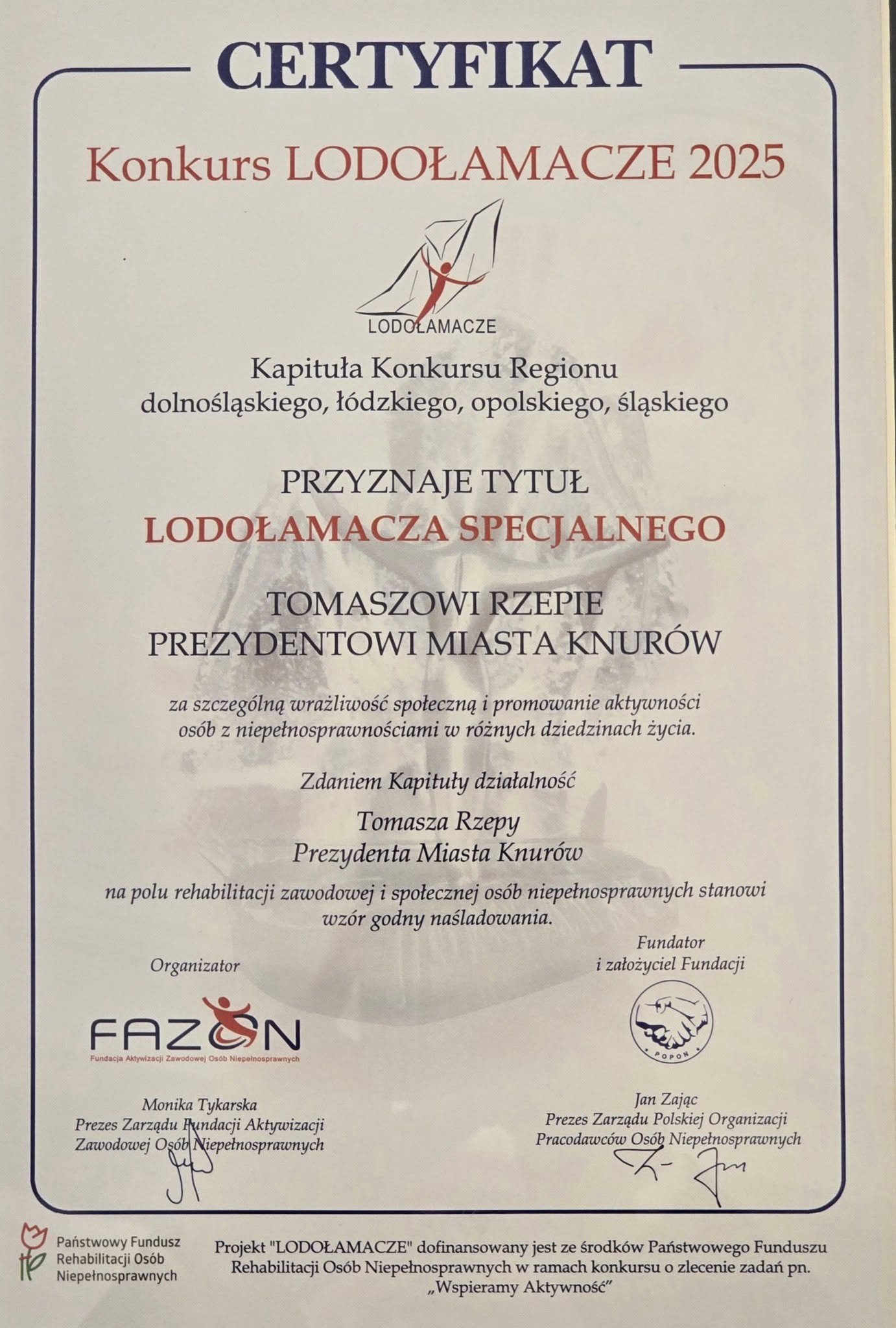 LODOŁAMACZ SPECJALNY – jedyne indywidualne wyróżnienie gali – trafił do Prezydenta Miasta Knurów Tomasz Rzepa