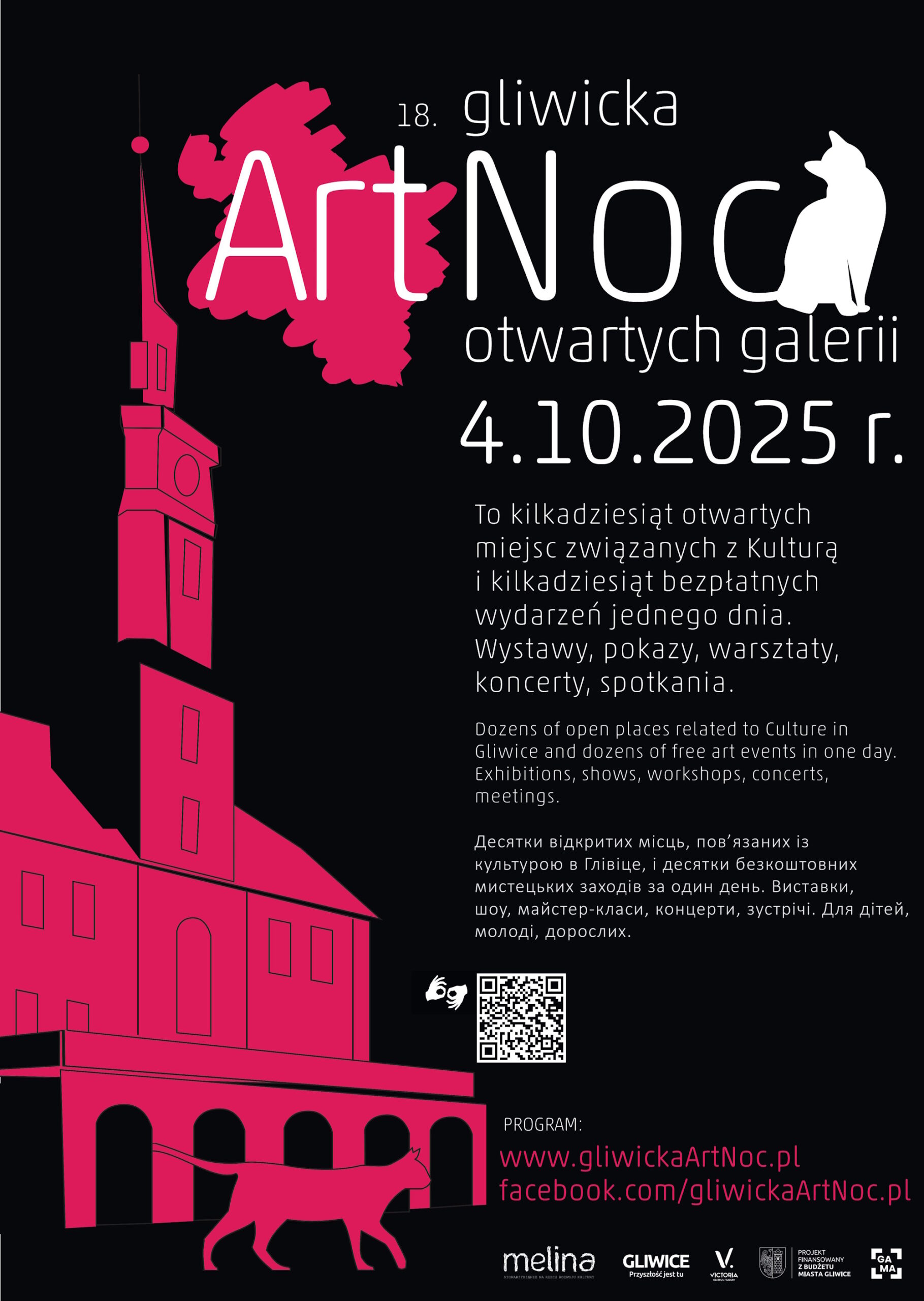 Na mapie tegorocznej ArtNocy znalazło się ponad czterdzieści punktów, w których będzie można zobaczyć wystawy, wziąć udział w wernisażach, warsztatach, pokazach i koncertach. Oprócz klasycznych przestrzeni, takich jak galerie czy teatry, organizatorzy zaplanowali wydarzenia także w miejscach, które na co dzień trudno skojarzyć ze sztuką. To okazja, aby zobaczyć Gliwice z innej perspektywy – zajrzeć do Ruin Teatru Victoria, poczuć atmosferę Starego Cmentarza Żydowskiego albo odkryć kawiarnie i przestrzenie, które na tę jedną noc zamienią się w artystyczne sceny.