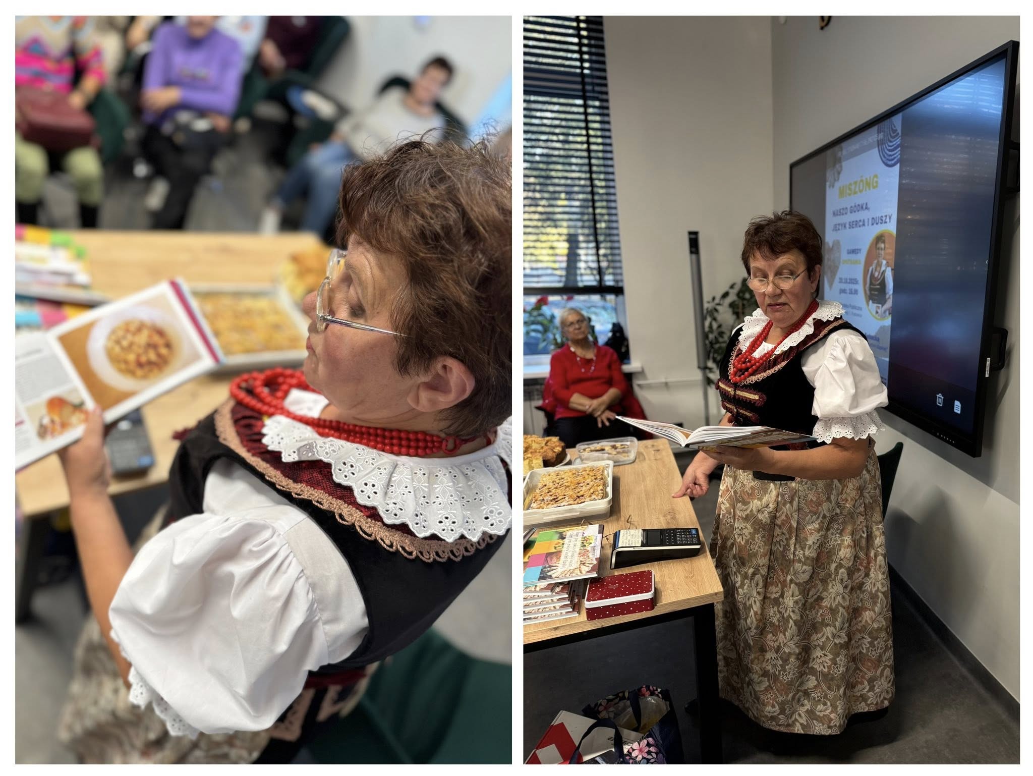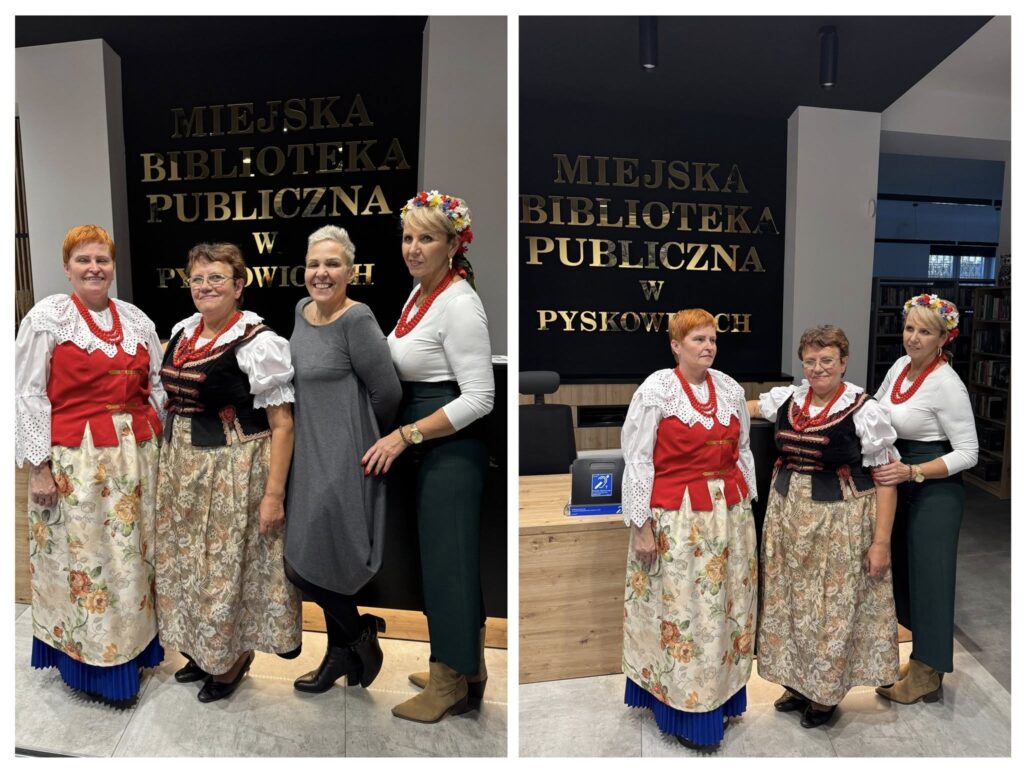 👍 Spotkanie miało wyjątkowy klimat również dzięki strojom – autorka wystąpiła w pięknym śląskim ubraniu, a w podobnych pojawiły się również panie z naszej biblioteki, podkreślając lokalny charakter wydarzenia.
