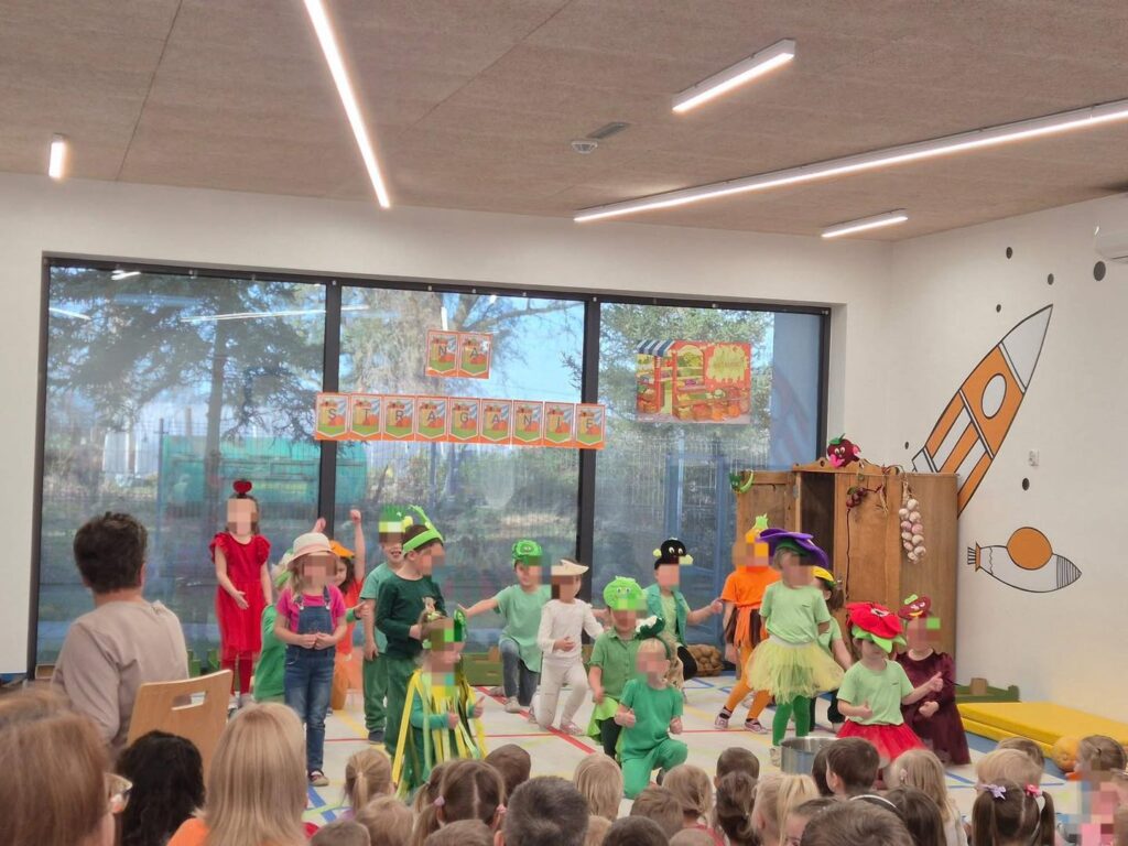 Pięknie poprzebierane dzieci zaprezentowały swoją interpretację wiersza Jana Brzechwy „Na straganie” 🥕🫛, a całość uświetniły radosne piosenki i dziecięcy entuzjazm 🎶.