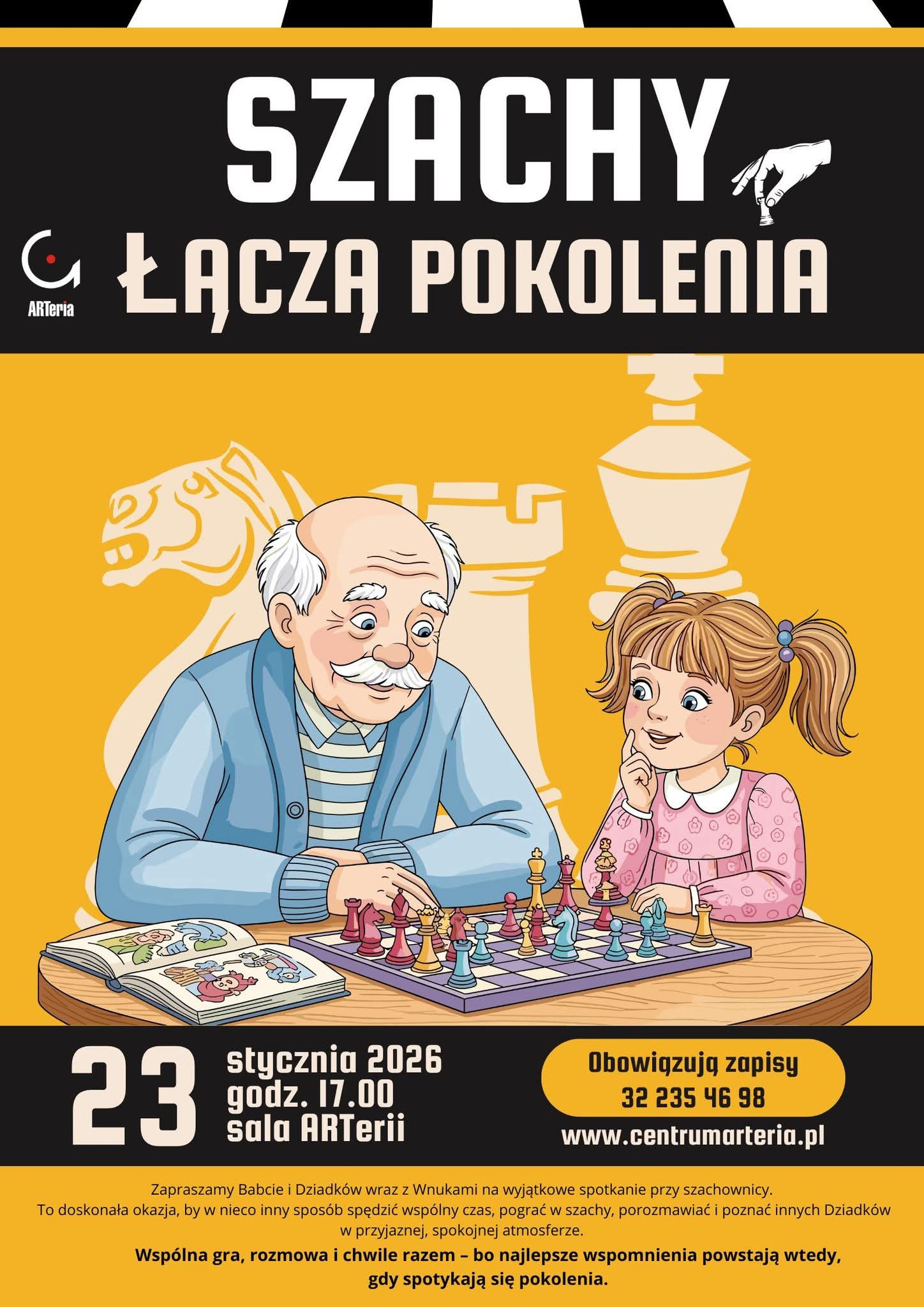 Centrum ARTeria w Ornontowicach zaprasza mieszkańców gminy na wydarzenie międzypokoleniowe pod hasłem „Szachy łączą pokolenia”, organizowane z okazji Dnia Babci i Dziadka.