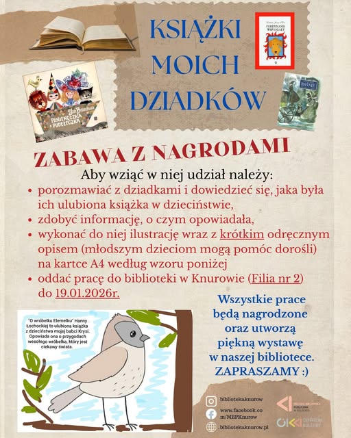 Filia nr 2 Miejskiej Biblioteki Publicznej w Knurowie zaprasza dzieci i młodzież do udziału w inicjatywie łączącej pokolenia. Akcja „Książki moich dziadków” to nie tylko konkurs plastyczny z nagrodami, ale przede wszystkim okazja do wspólnego spędzenia czasu wnuków i dziadków.