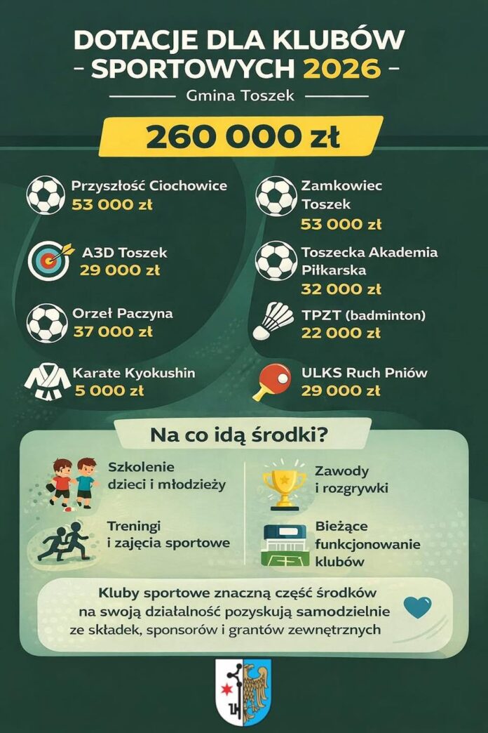 Burmistrz Gminy Toszek rozstrzygnął otwarty konkurs ofert na realizację zadań publicznych w zakresie wspierania i upowszechniania kultury fizycznej. W 2026 roku na działalność sportową lokalnych klubów przeznaczono łącznie 260 000 zł.