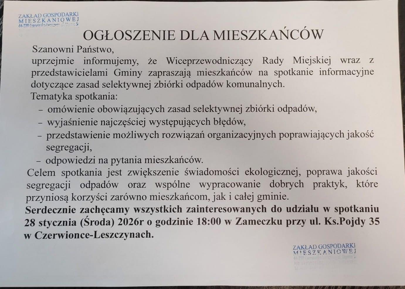 Mieszkańcy gminy Czerwionka-Leszczyny zainteresowani „gminną gospodarką śmieciową” zapraszani są na spotkanie