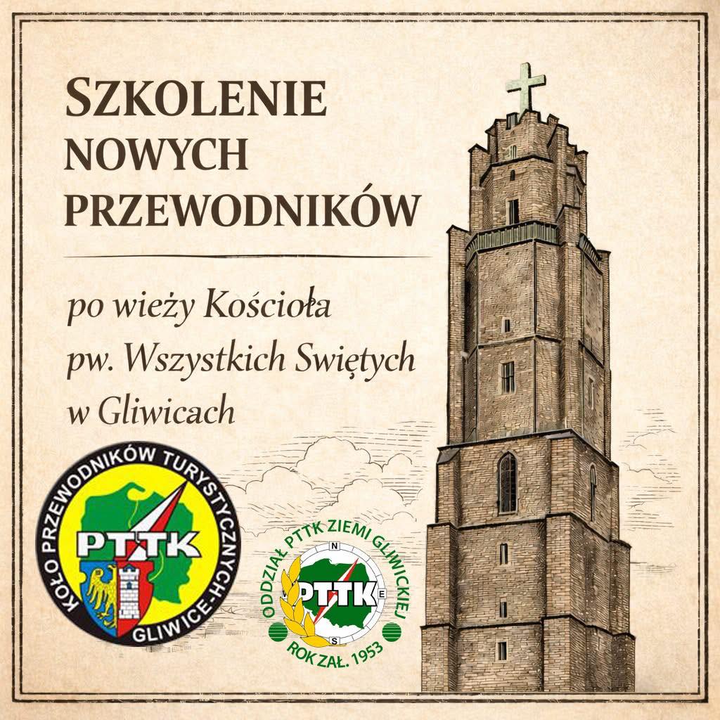 Koło Przewodników Turystycznych w Gliwicach Oddział PTTK Ziemi Gliwickiej zaprasza do udziału w szkoleniu na przewodników po wieży kościoła pw. Wszystkich Świętych. To propozycja dla osób zainteresowanych historią miasta, architekturą oraz aktywnym udziałem w popularyzacji lokalnego dziedzictwa.