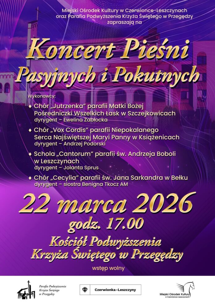 Miejski Ośrodek Kultury w Czerwionce-Leszczynach oraz Parafia Podwyższenia Krzyża Świętego w Przegędzy serdecznie zapraszają na Koncert Pieśni Pasyjnych i Pokutnych. Wydarzenie odbędzie się w niedzielę, 22 marca 2026 roku o godz. 17.00, w kościele w Przegędzy.