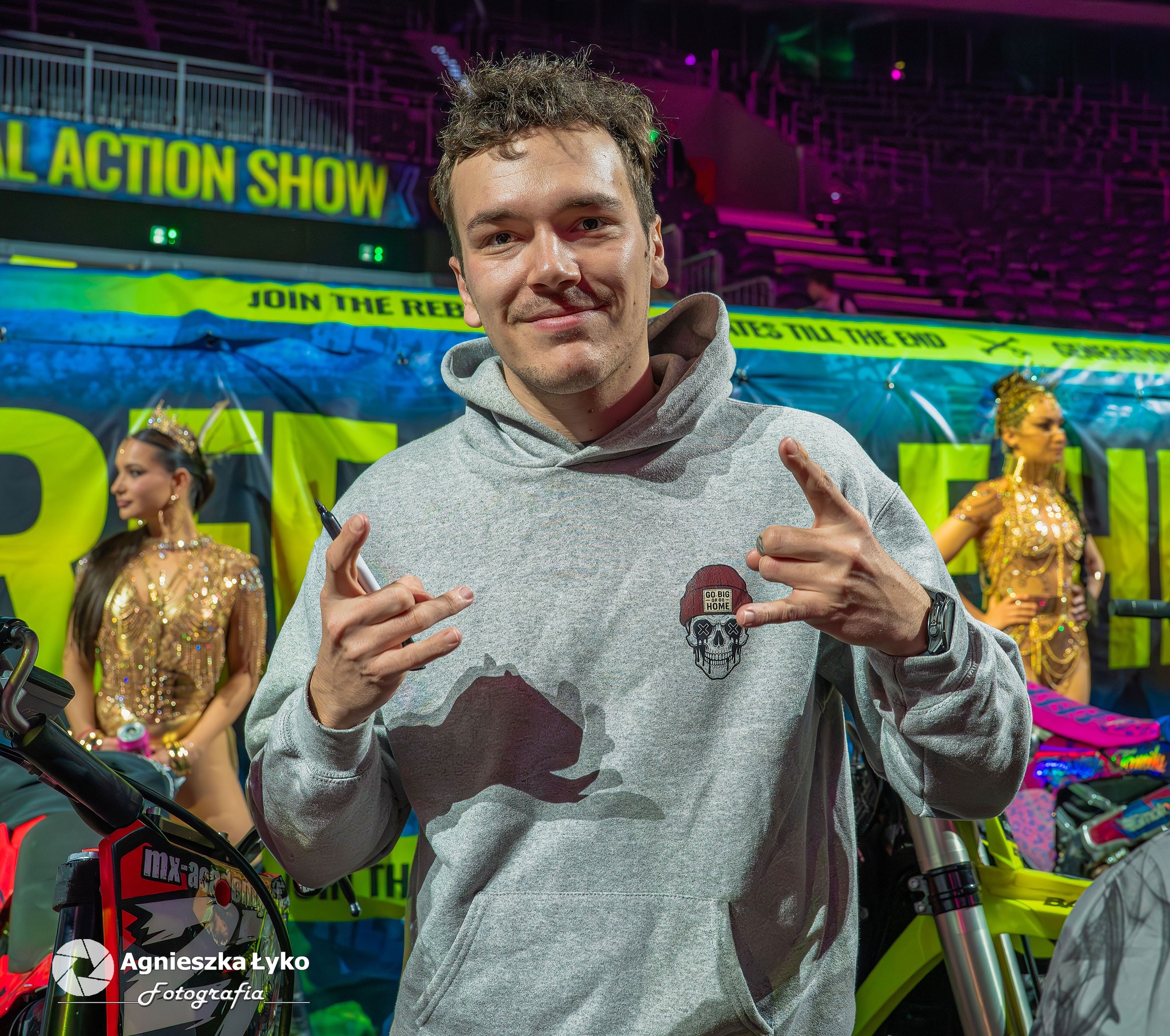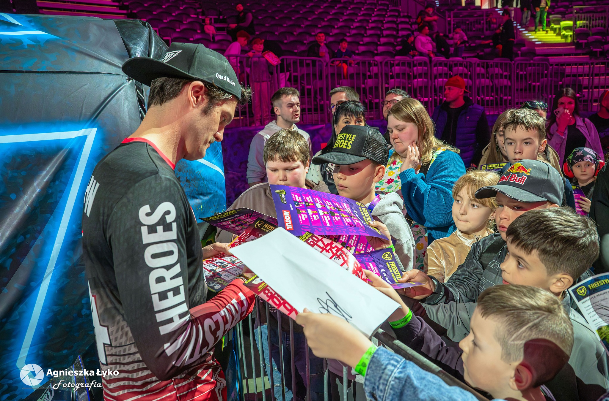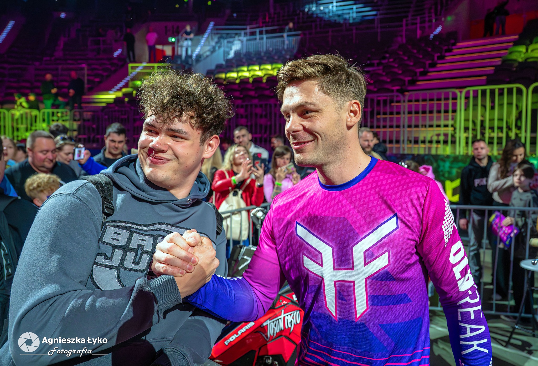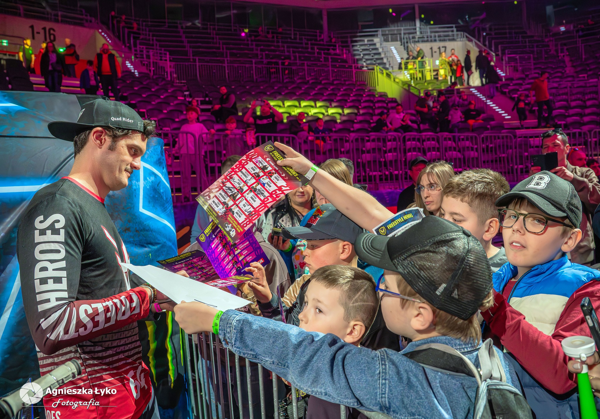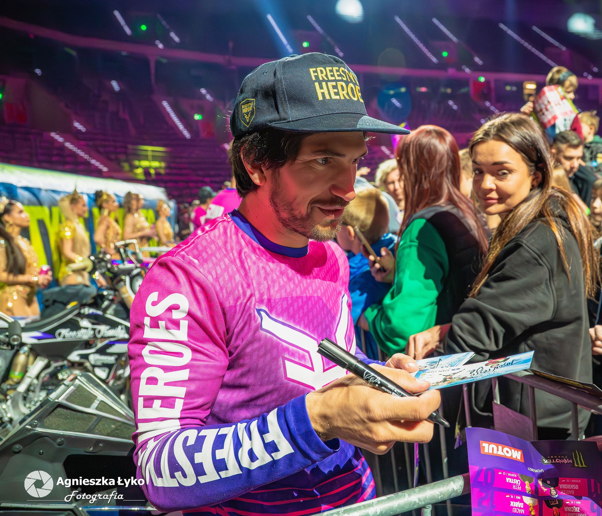 Zanim jednak maszyny ryknęły na głównej płycie, fani mieli niepowtarzalną okazję wejść za kulisy podczas Pit Party. Był to jedyny moment, kiedy bariery między trybunami a płytą całkowicie zniknęły. Kibice mogli z bliska podziwiać potężne silniki motocykli FMX oraz precyzyjną budowę profesjonalnych rowerów MTB i BMX. Największe emocje budziło jednak spotkanie oko w oko z idolami – każdy mógł podejść, przybić piątkę z zawodnikami czy poprosić o autograf na plakacie. Wspólne zdjęcia z takimi gwiazdami jak Marcin Łukaszczyk czy Szymon Godziek były dla wielu młodych pasjonatów spełnieniem marzeń i pamiątką na całe życie.