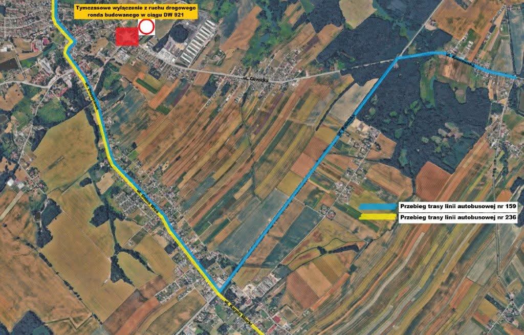 ● ​Linie 159 i 236: Autobusy pominą przystanki przy ul. Gliwickiej. Od przystanków „Kuźnia Skrzyżowanie” (l. 159) oraz „Wilcza Skrzyżowanie” (l. 236) pojazdy pojadą trasą alternatywną przez ulice: Rybnicką, Karola Miarki, Dolną Wieś oraz Dworcową.