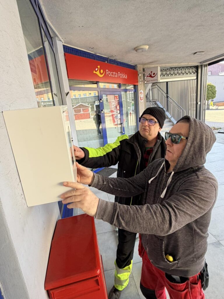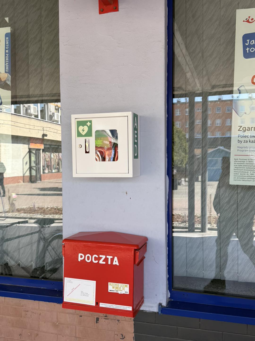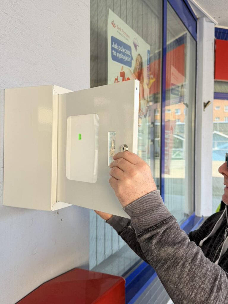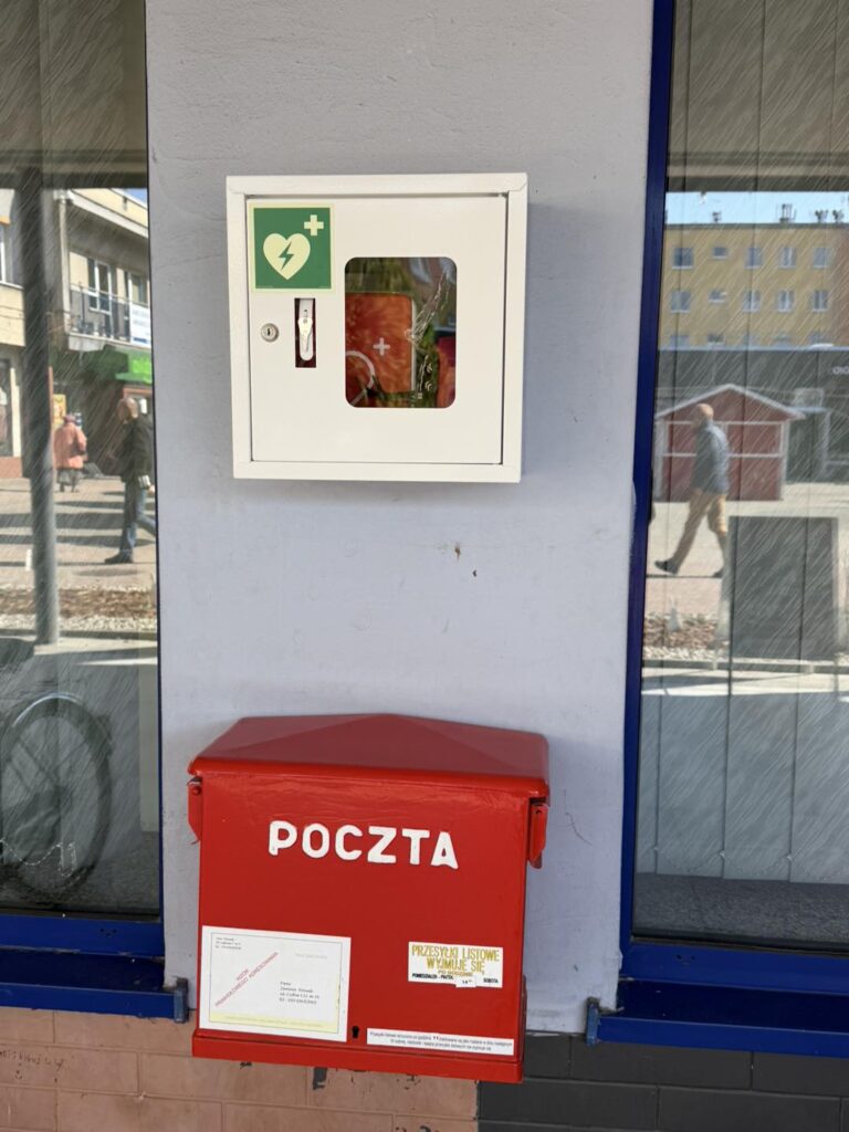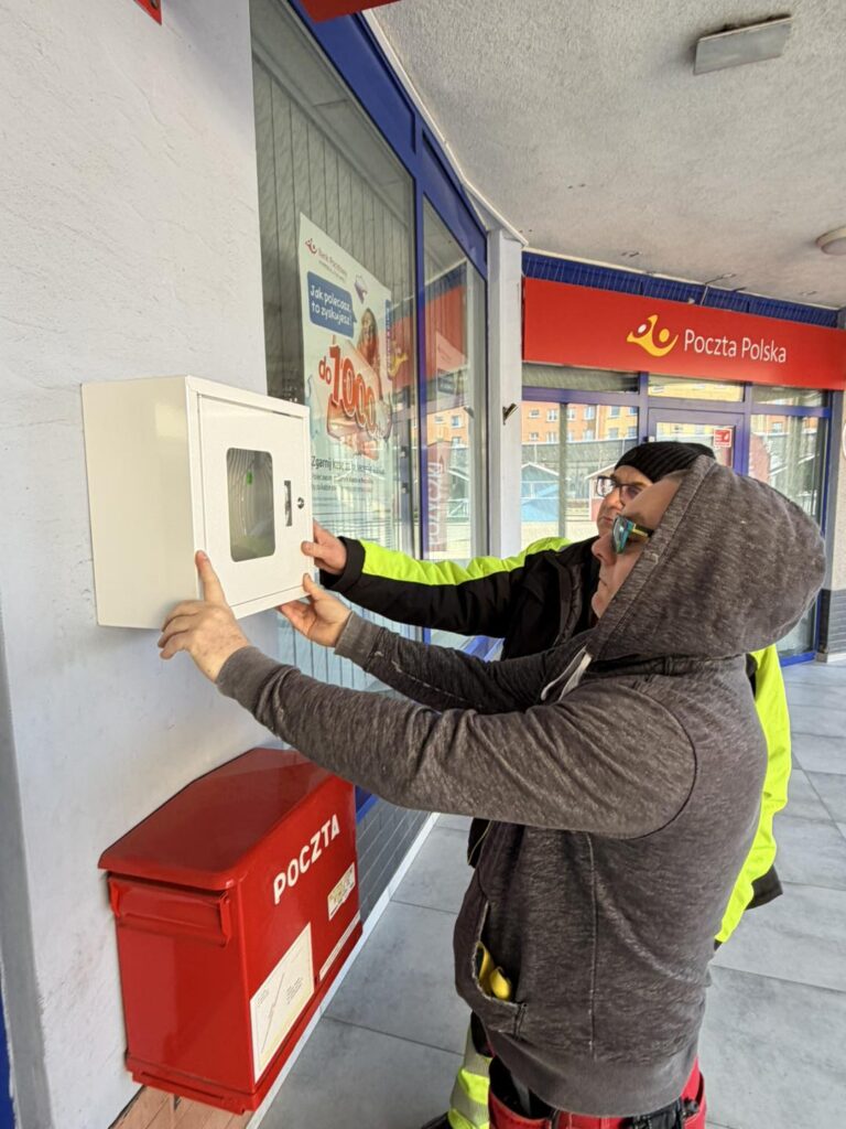 Na terenie Kompleksu MERKURY zamontowano defibrylator AED. Urządzenie znajduje się w bezpośrednim sąsiedztwie wejścia do placówki pocztowej i jest dostępne dla wszystkich osób przebywających w okolicy.