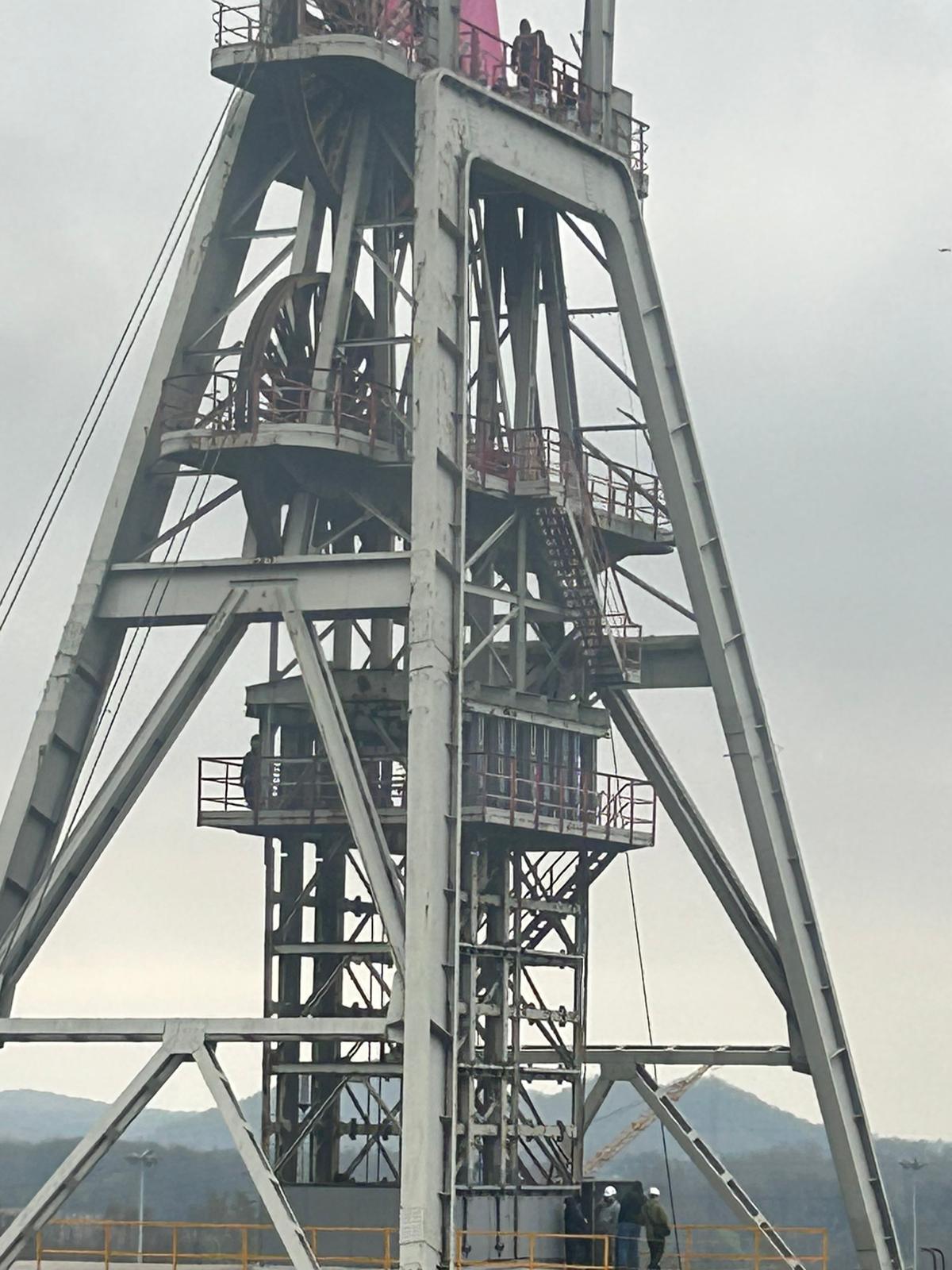 Na miejscu interweniują funkcjonariusze policji oraz zastępy Państwowej Straży Pożarnej z Knurowa. Obecnie priorytetem służb jest zabezpieczenie terenu oraz zapewnienie bezpieczeństwa osobom przebywającym na wysokości.