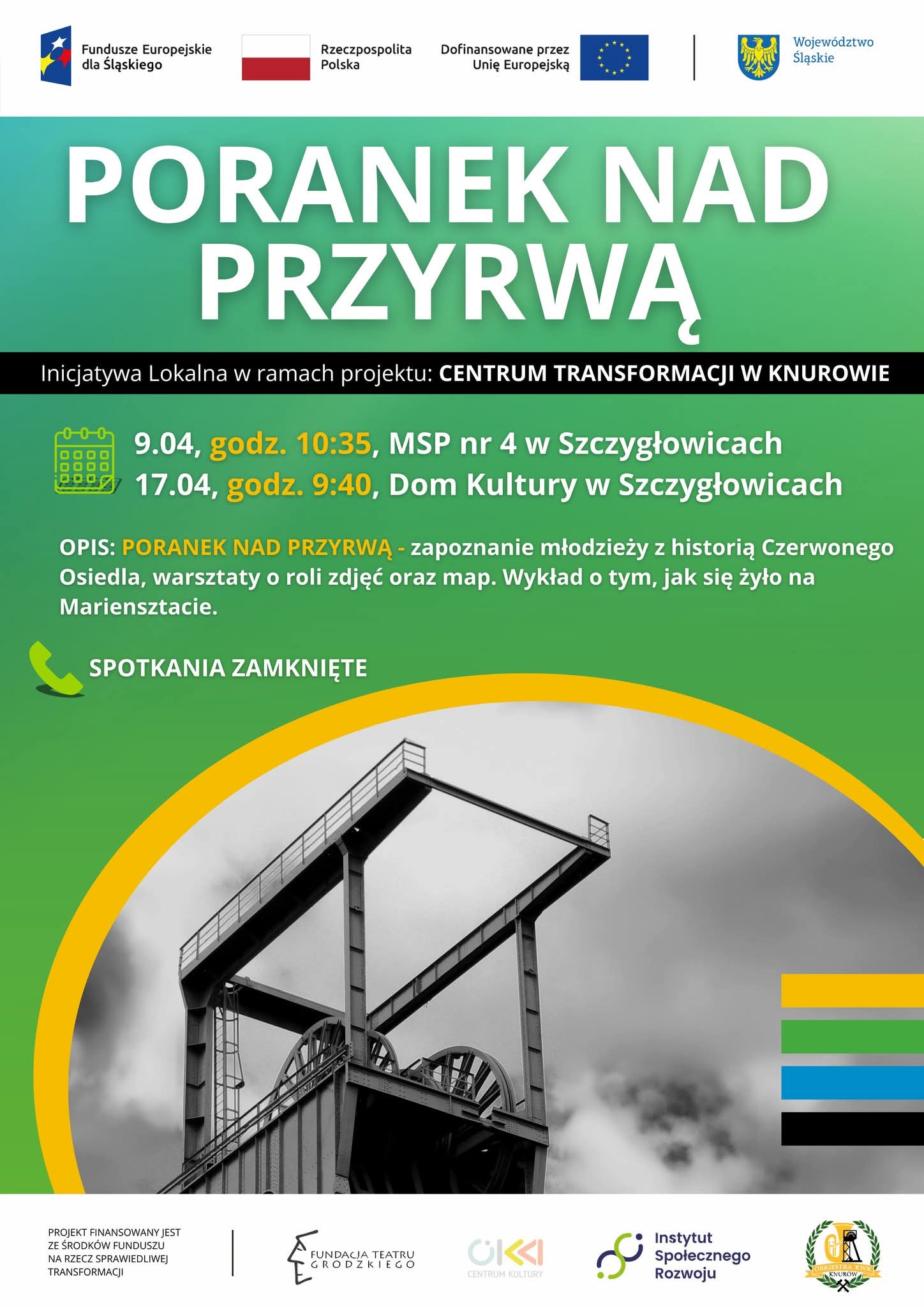 Inicjatywa Lokalna „Poranek nad Przyrwą” jest realizowana w ramach projektu „Centrum Transformacji w Knurowie” współfinansowanego przez Unię Europejską w ramach Funduszy Europejskich dla Śląskiego 2021–2027, Działanie 10.24 – Włączenie społeczne – wzmocnienie procesu sprawiedliwej transformacji.