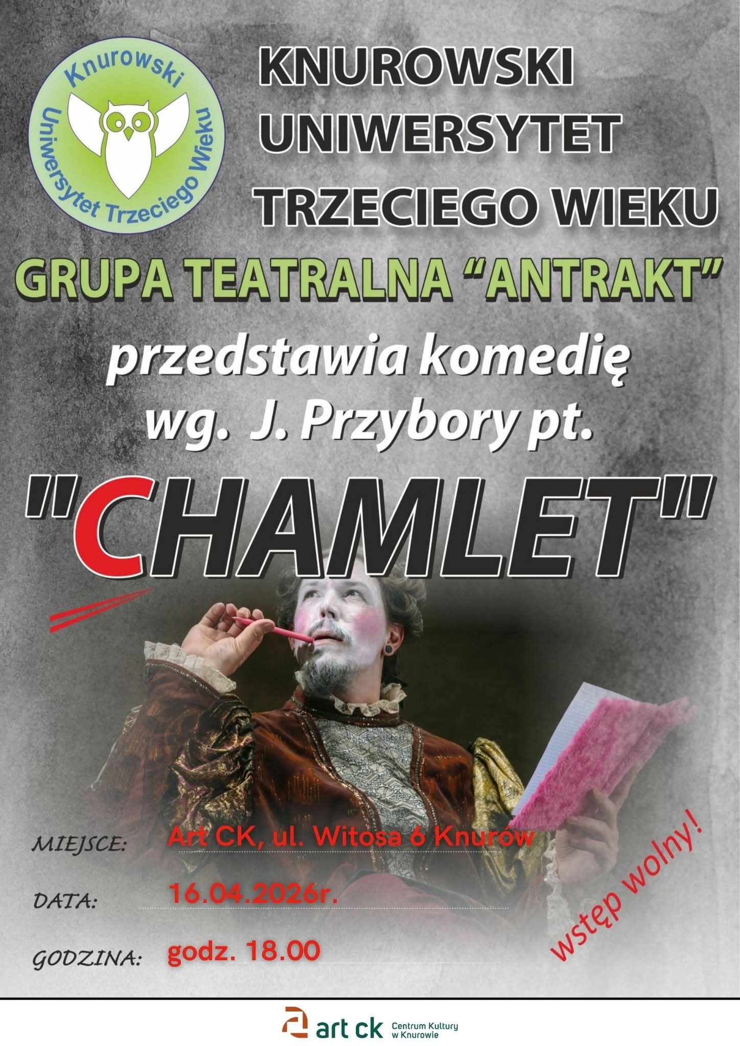 Knurowski Uniwersytet Trzeciego Wieku zaprasza mieszkańców na wydarzenie kulturalne. Już w najbliższą środę, 22 kwietnia, na scenie Art CK wystąpi grupa teatralna „Antrakt”.