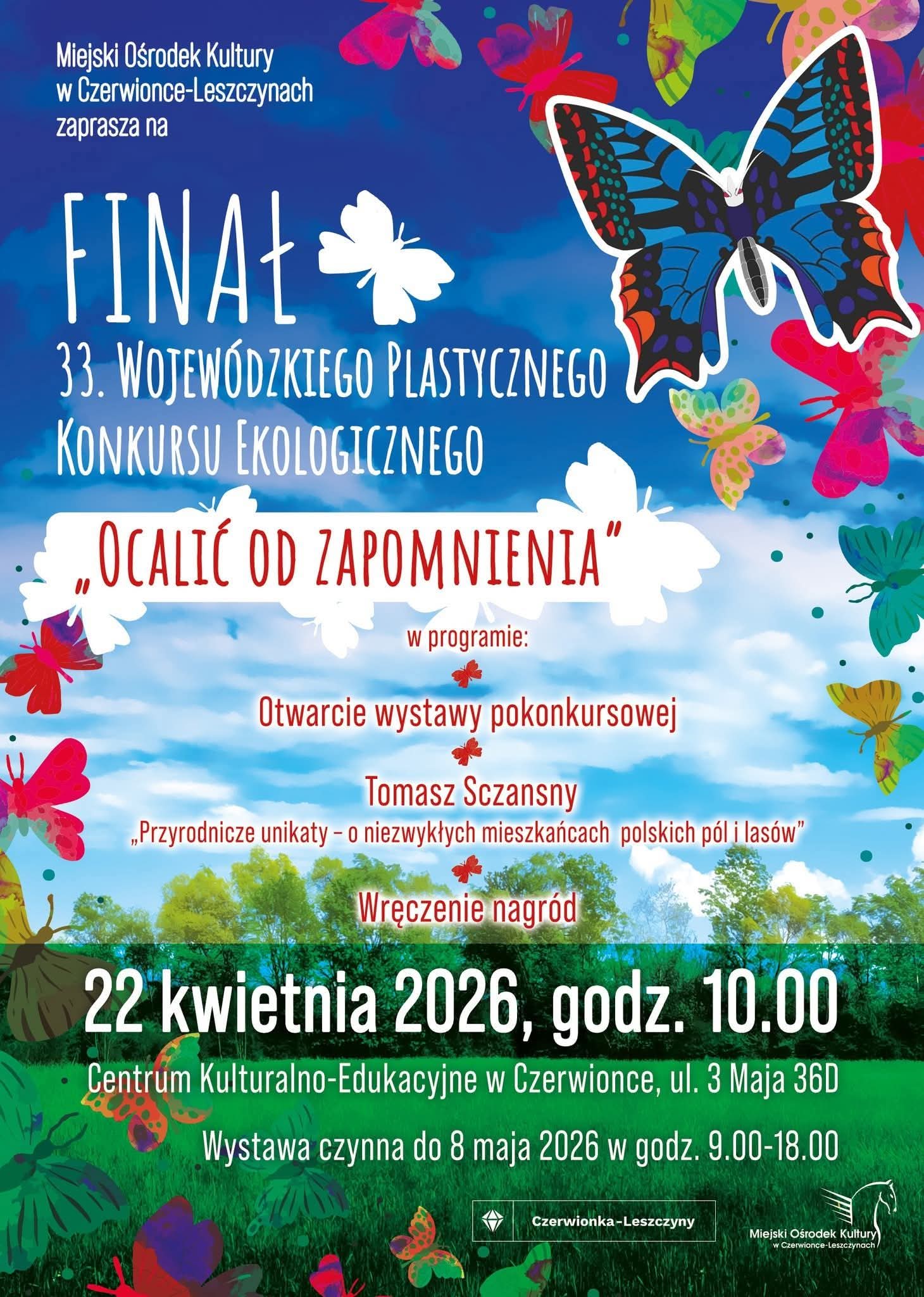 Miejski Ośrodek Kultury w Czerwionce-Leszczynach zaprasza na uroczysty finał 33. Wojewódzkiego Plastycznego Konkursu Ekologicznego pt. „Ocalić od zapomnienia”. Wydarzenie odbędzie się 22 kwietnia 2026 roku o godz. 10.00 w Centrum Kulturalno-Edukacyjnym.