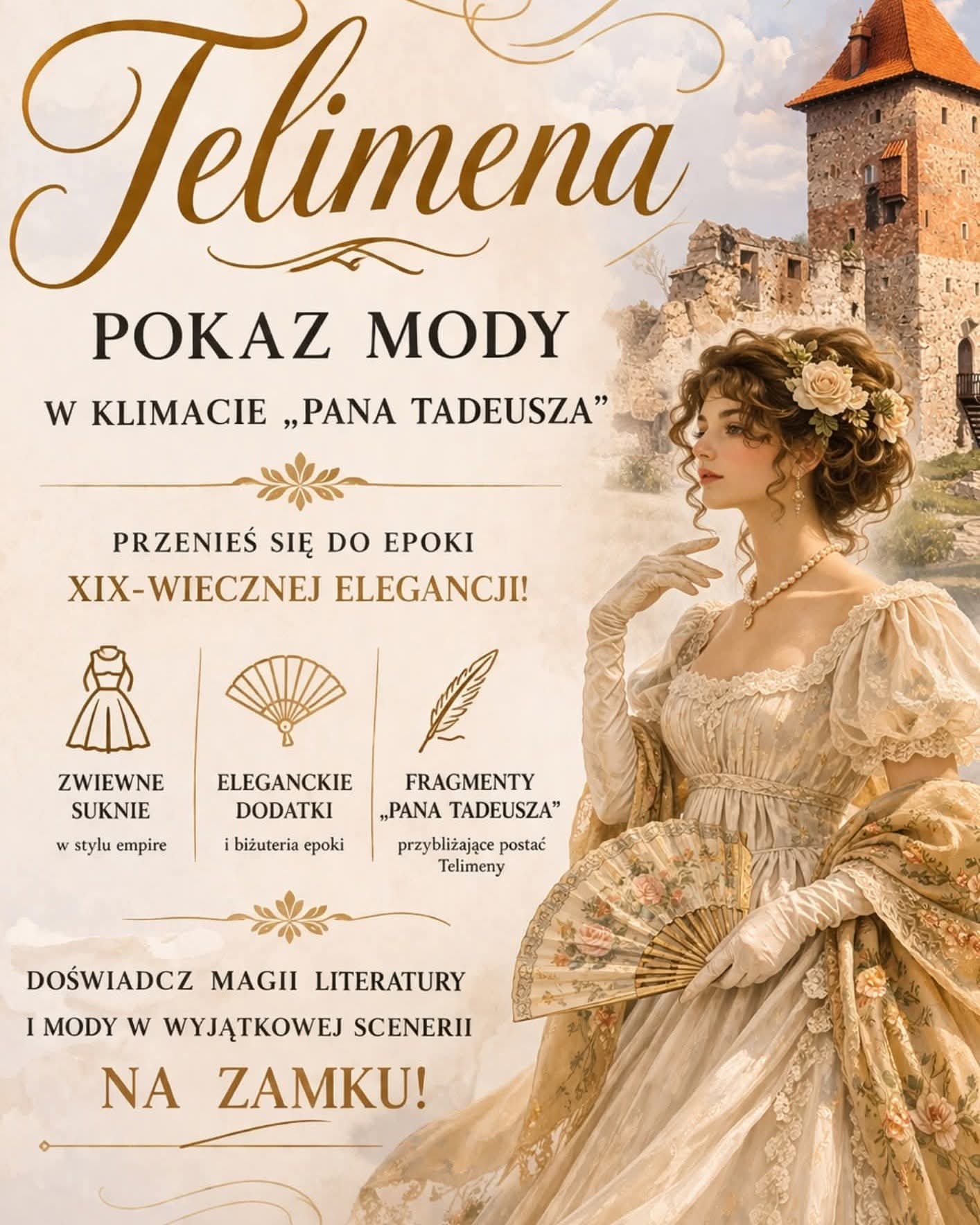 Podczas pokazu „Telimena” zobaczymy na żywo XIX-wieczną elegancję – od koronkowych wachlarzy po szlachetne suknie empire. Całość dopełnią fragmenty „Pana Tadeusza”, które ożywią literacką historię w murach starego zamczyska.
