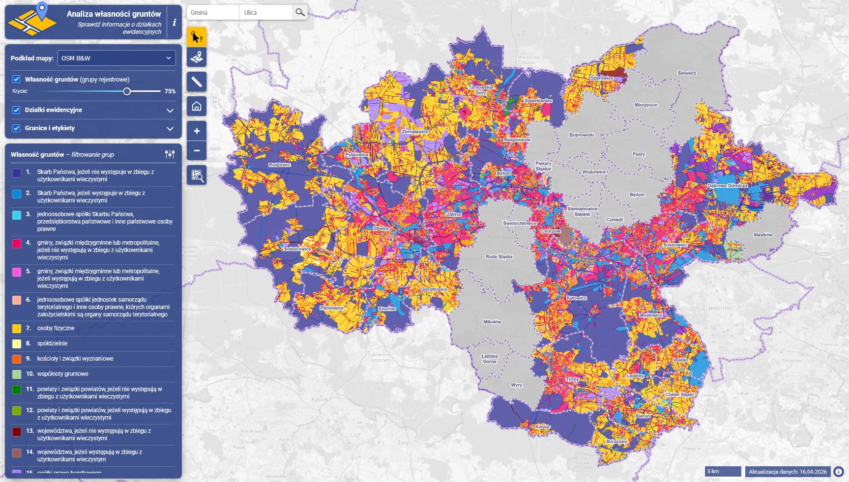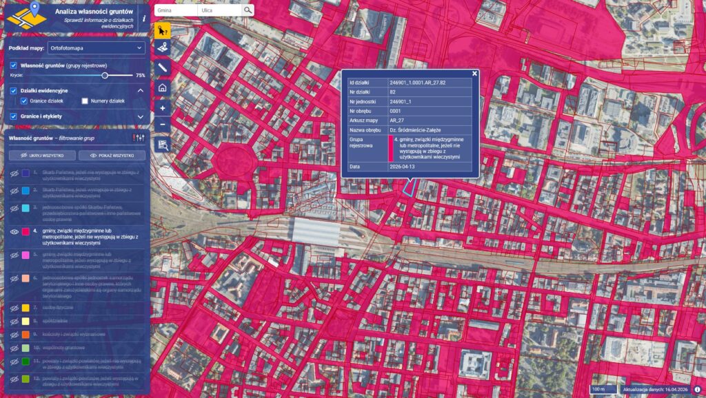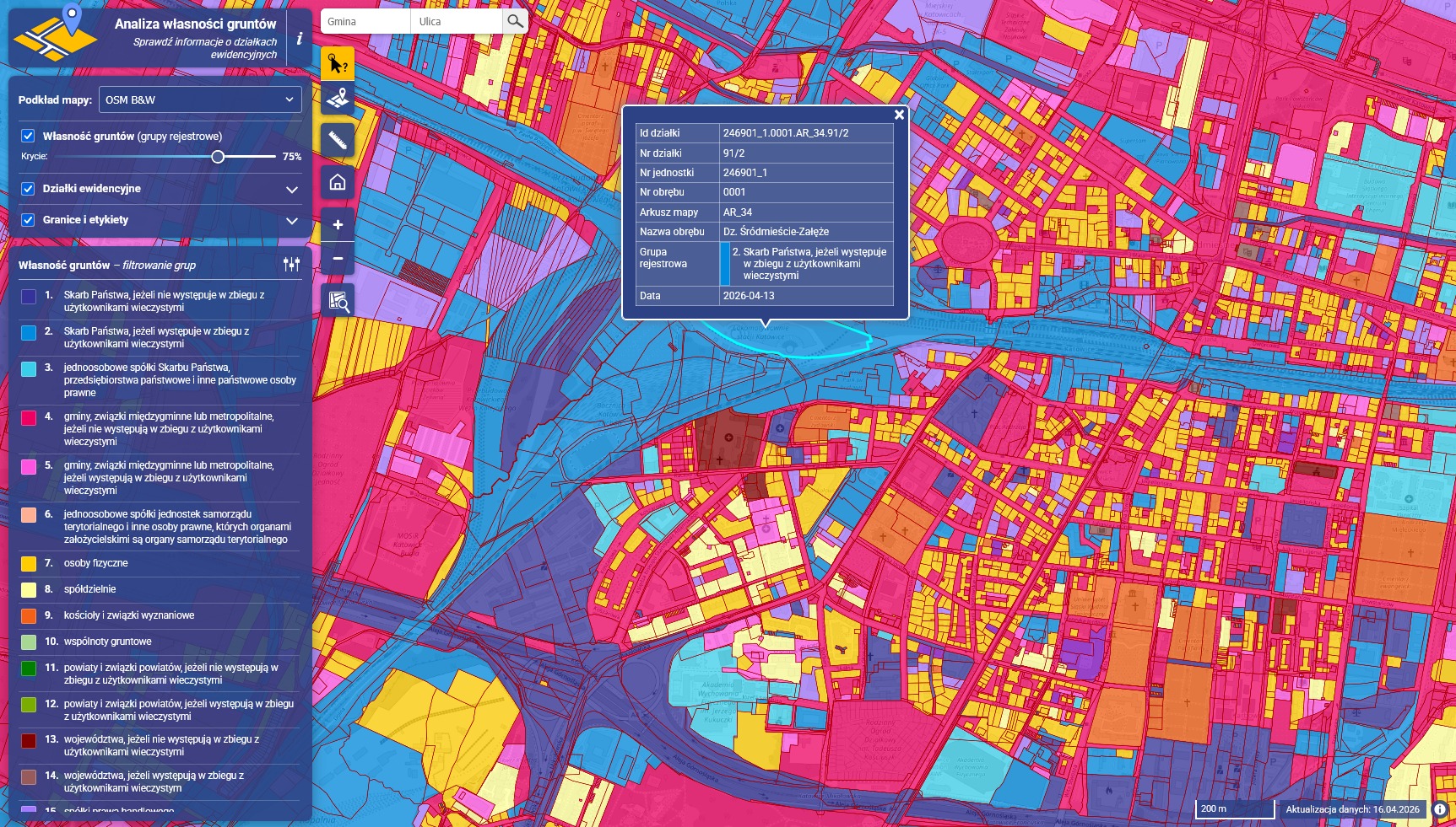 📊 Filtruj dane według kategorii własności oraz wyszukuj nieruchomości po numerze działki lub nazwie ulicy.